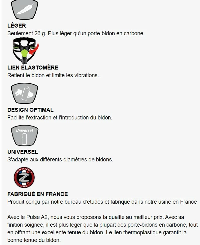 D’une construction inédite, le porte-bidon Pulse est l’alliance de deux matières aux propriétés distinctes. Le cœur de la structure en composite renforcé apporte la rigidité nécessaire afin de réduire les vibrations et assurer un excellent maintien du bidon. Tandis que la résine technopolymère apporte de la souplesse et de la brillance au porte-bidon pour faciliter son utilisation.